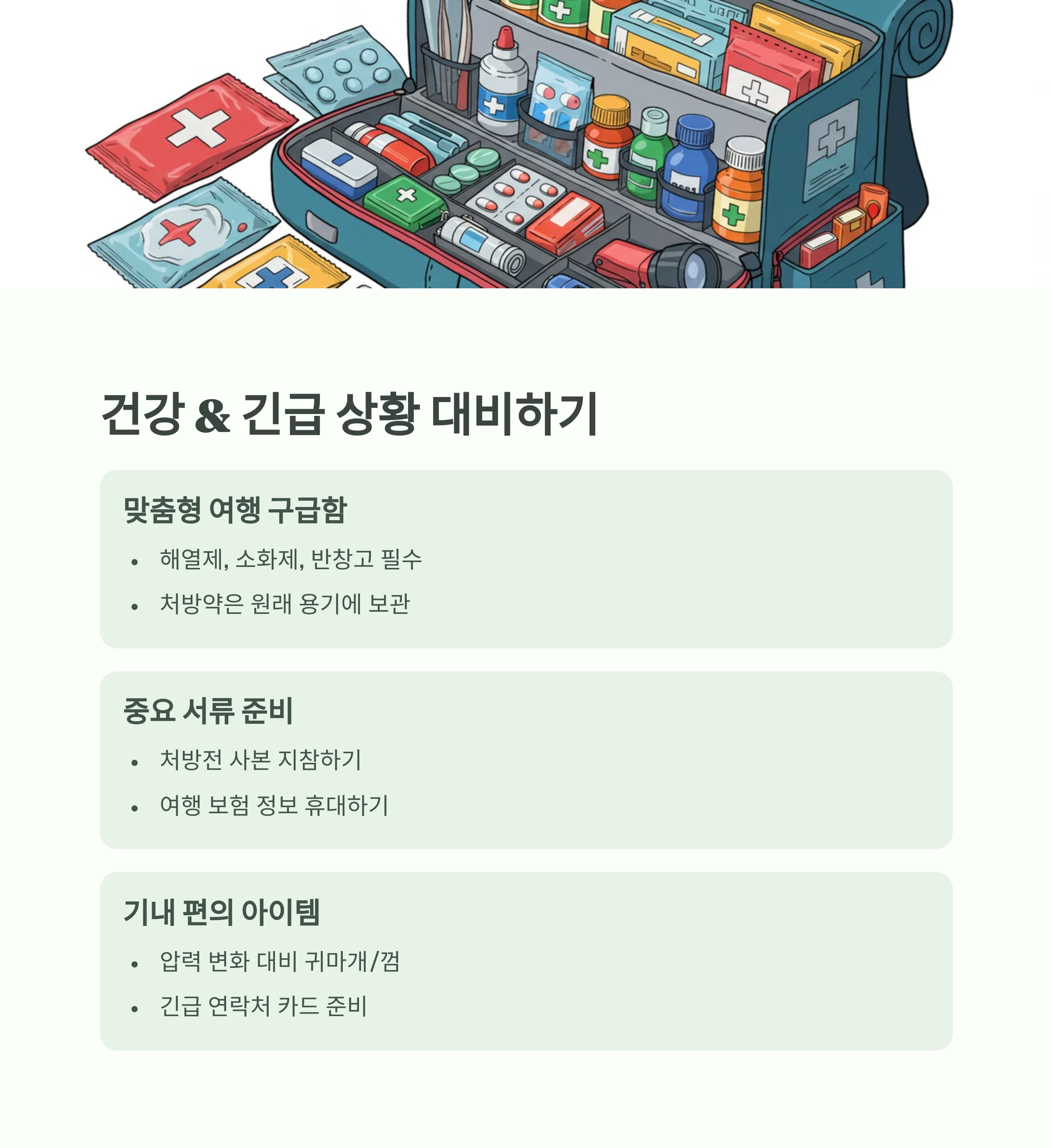 | 여행 가방 준비 체크리스트 | 기본 의류, 세면도구, 전자기기 순서로 담기 |