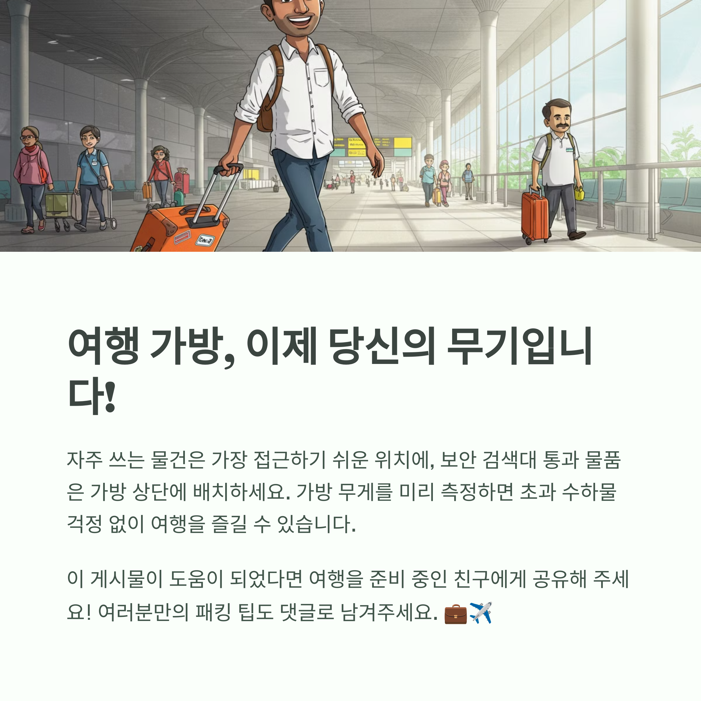 여행을 떠나기 전, 여러분은 어떤 기준으로 짐을 챙기시나요? 본문에서 소개하지 않은 꿀팁이나 여러분의 경험을 공유해주시면 더 풍성한 자료가 됩니다. 댓글이나 커뮤니티를 통해 소소한 꿀템도 함께 나눠보아요!